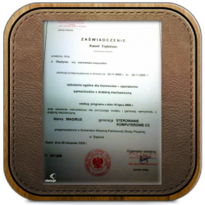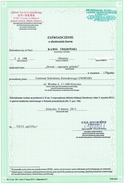Drwal – operator pilarki Zaświadczenie o ukończeniu kursu "Drwal - operator pilarki" po ukończeniu, którego można samodzielnie wycinać drzewa bez ograniczeń co do wielkości.