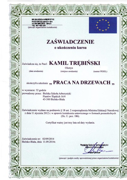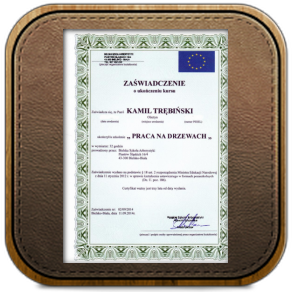 Kurs Arborysty Zaświadczenie o ukończeniu kursu "Praca na drzewach".
